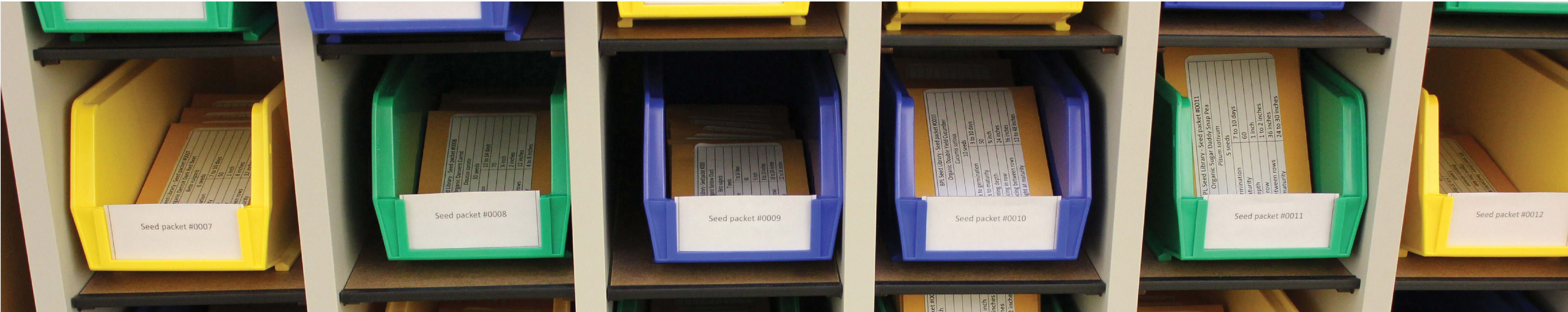 Our seed library features a variety of open-pollinated vegetables and some herbs and flowers. Select your seeds in person at the Information Desk, while supplies last. Seed libraries like these support sustainability and food security by allowing the community free access to the means of growing their own food.